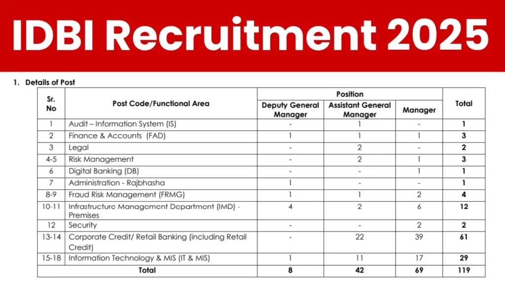 IDBI Bank Junior Assistant Manager (JAM) Recruitment 2025: IDBI Bank has officially announced the Junior Assistant Manager (JAM) Recruitment 2025 under the Post Graduate Diploma in Banking and Finance (PGDBF) program. The selected candidates will undergo a 1-year training program consisting of 6 months of classroom studies, 2 months of internship, and 4 months of … Read more